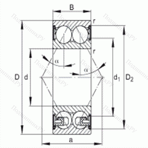 Основные размеры по DIN 628-3, двухрядные, щелевые уплотнения с двух сторон, угол контакта α = 30°